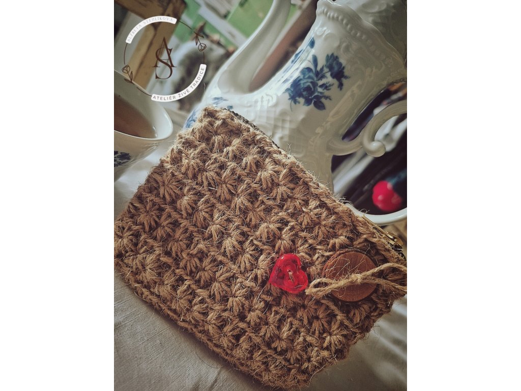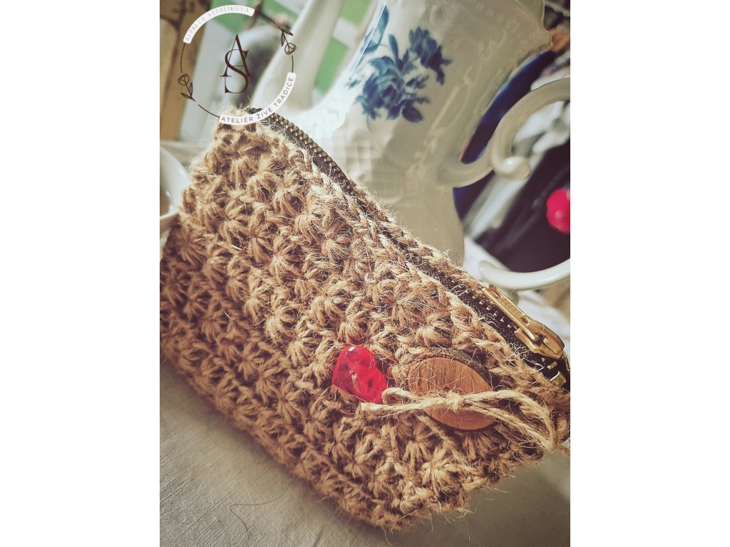 Ručně háčkovaná kapsička na zip, vytvořená z pevné špagátové příze.