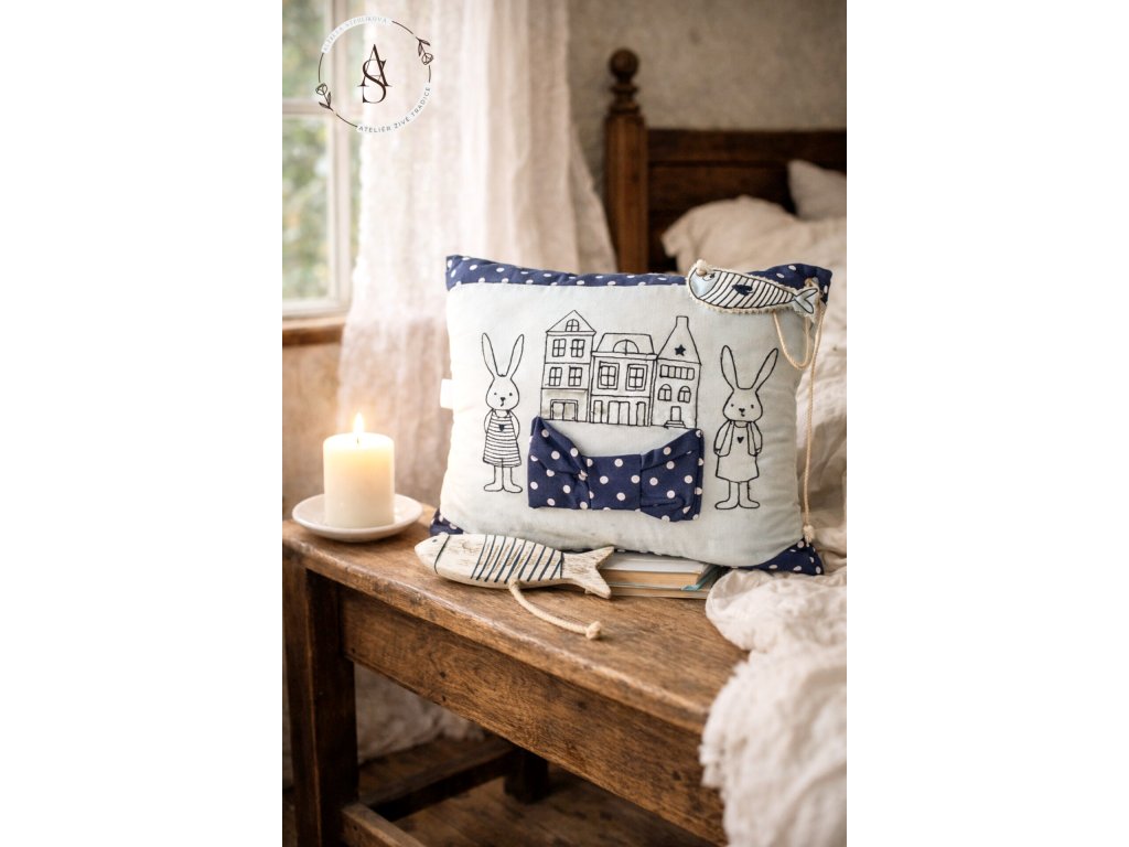 Polštář v kombinaci se strojovou výšivkou. Veselé obrázky a rybičky pro štěstí. Výplň duté vlákno - antialergické.
