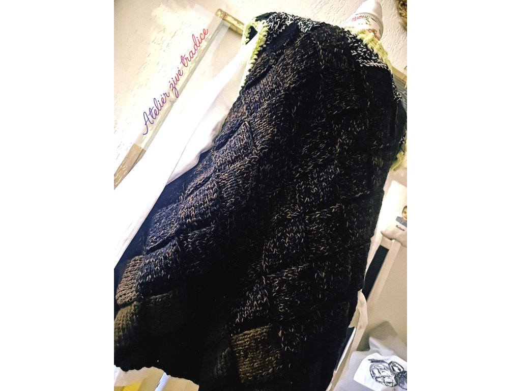 Tato vesta je pletená speciální patchworkovou technikou, díky které vzniká jedinečný plastický vzor. Každý čtverec je pečlivě pleten ručně a vytváří krásnou mozaiku barev.