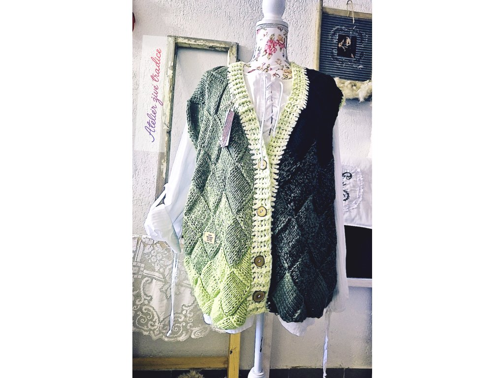 Materiál je kombinace jemných akrylových přízí v různých odstínech – přední díl přechází od béžové přes světle zelenou až po tmavě zelenou. Zadní díl kombinuje tmavě a světle hnědou, které skvěle ladí se zelenou a dávají vestě příjemně podzimní vzhled.